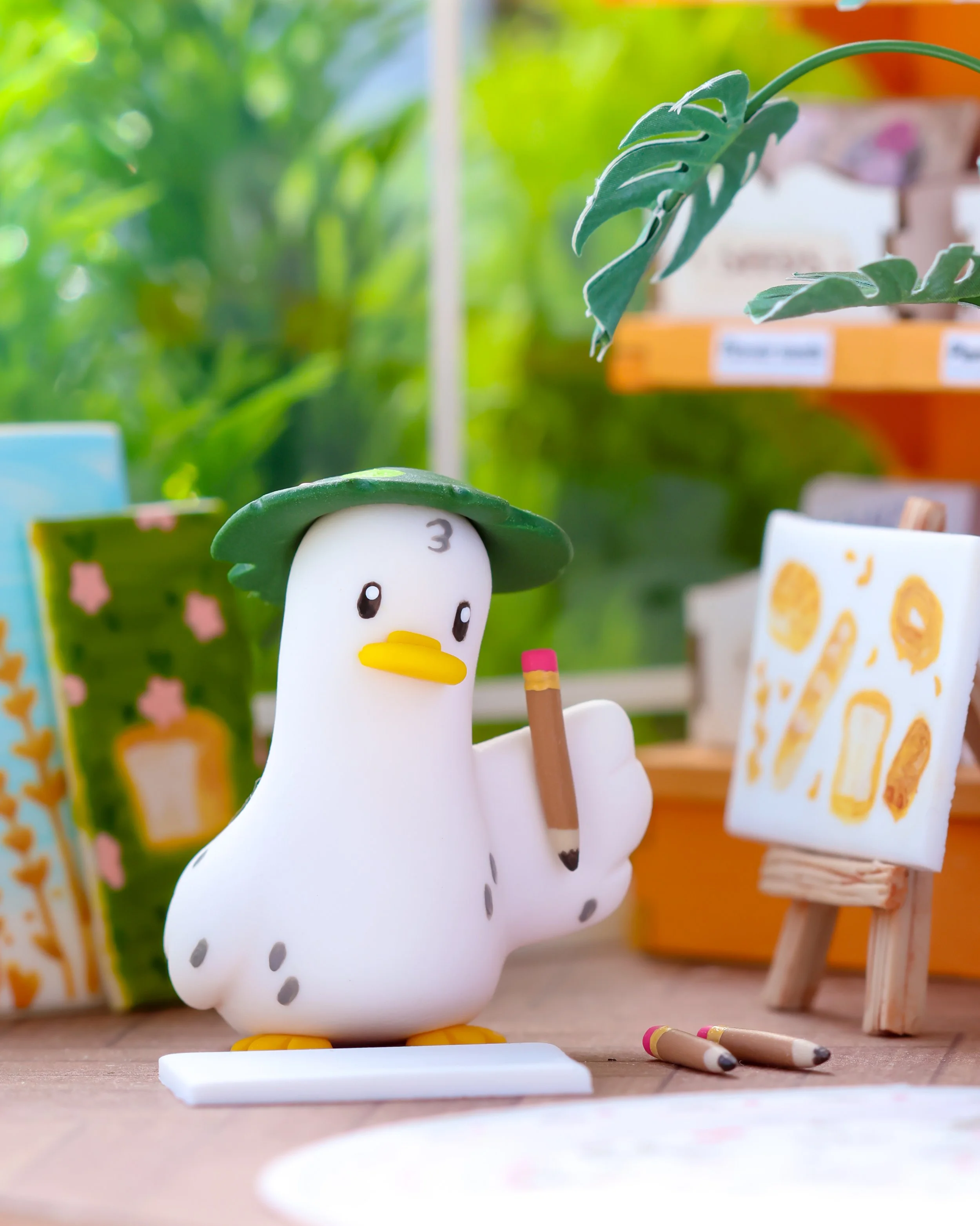 You can find Doug waddling about the forest, armed with his painting easel and wearing his signature lily pad hat (which doubles as a handy painting palette).